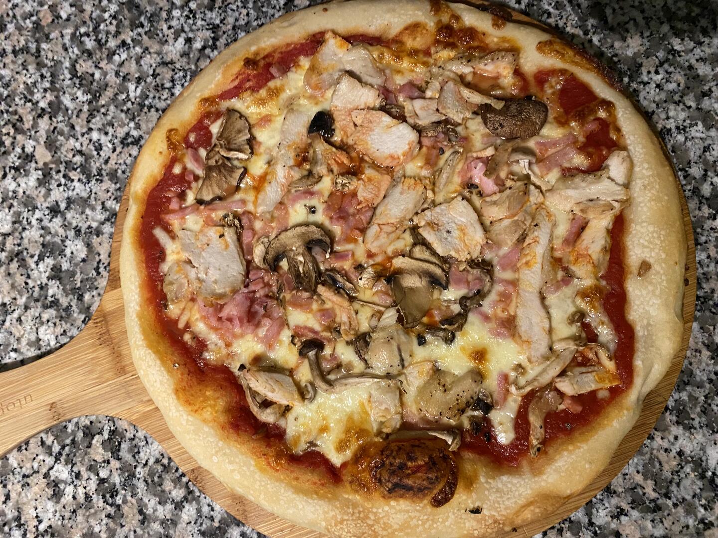 Half-moon folded pizza filled mozzarella cheese, ham and mushrooms topped with a dash of tomato sauce.